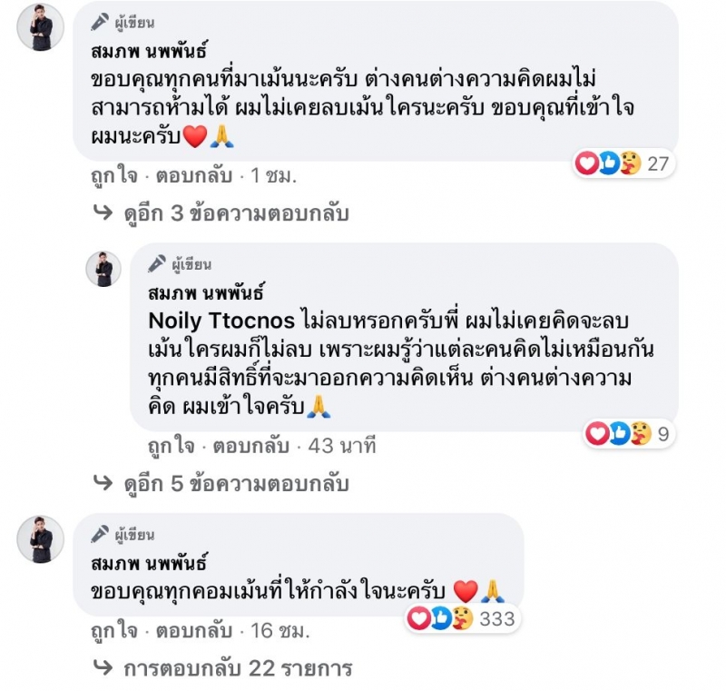 แต่ทว่า ปาล์ม สมภพ นพพันธ์ ก็ได้เข้ามาคอมเม้นต์ว่า ขอบคุณทุกคนที่มาเม้นนะครับ ต่างคนต่างความคิดผมไม่สามารถห้ามได้ ผมไม่เคยลบเม้นใครนะครับ ขอบคุณที่เข้าใจผมนะครับ ไม่ลบหรอกครับพี่ ผมไม่เคยคิดจะลบ เม้นต์ใครผมก็ไม่ลบ เพราะผมรู้ว่าแต่ละคนคิดไม่เหมือนกัน ทุกคนมีสิทธิ์ที่จะมาออกความคิดเห็น ต่างคนต่างความคิด ผมเข้าใจครับ