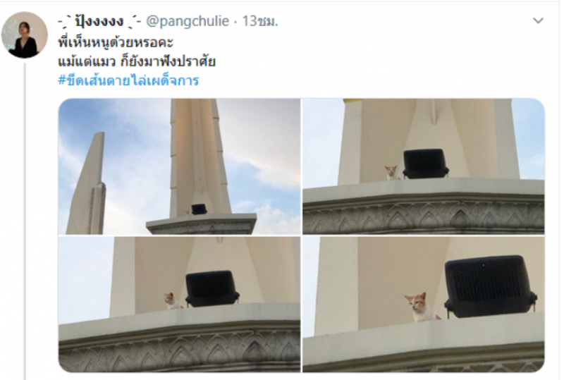 โดยสายตาที่จ้องมองมายังผู้ชุมนุมนั่นก็คือเจ้าเหมียวนั่นเอง เมื่อภาพดังกล่าวเผยแพร่ออกไปจนกลายเป็นไวรัล ไทยแลนด์ไปแล้วน่ารักมากๆ
