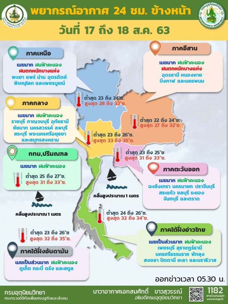 ลักษณะอากาศทั่วไป อากาศ 24 ชั่วโมงข้างหน้า มรสุมตะวันตกเฉียงใต้พัดปกคลุมทะเลอันดามันตอนบน ประเทศไทย และอ่าวไทย ประกอบกับมีหย่อมความกดอากาศต่ำปกคลุมบริเวณประเทศเวียดนามตอนบน ลักษณะเช่นนี้ทำให้ประเทศไทยตอนบนมีฝนต่อเนื่อง และมีฝนตกหนักบางแห่งในบริเวณทางด้านตะวันออกของภาคเหนือ และภาคตะวันออกเฉียงเหนือตอนบน ขอให้ประชาชนที่อาศัยในพื้นที่เสี่ยงภัยบริเวณดังกล่าว ระวังอันตรายจากฝนตกหนักและฝนที่ตกสะสมไว้ด้วย / ฝุ่นละอองขนาดเล็ก เนื่องจากขณะนี้ประเทศไทยมีฝนตกต่อเนื่อง ดังนั้นการเกิดหรือการสะสมของฝุ่นละออง/หมอกควัน ไม่มีหรือมีน้อย