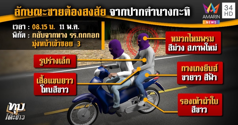 กรณีทีมข่าวอมรินทร์ทีวี ได้พูดคุยกับ นางกะทิ (นามสมมติ) ชาวบ้านอีกคนที่เห็นชายปริศนาสวมหมวกไหมพรมสีม่วง โดยนางกะทิ เล่าว่า วันที่ 11 พ.ค.63 ช่วงเวลาประมาณ 7 โมงกว่า ๆ ตนเห็นชายปริศนา รูปร่างสันทัด ขี่รถจักรยานยนต์ไปทางโรงเรียนกกกอก ท่าทีดูลุกลี้ลุกลน มองซ้ายมองขวาตลอดเวลาจนผิดสังเกต ซึ่งการเเต่งกาย สวมหมวกไหมพรมสีม่วง สภาพใหม่ สวมเสื้อเเขนยาวโทนสีขาว สวมกางเกงยีนส์ขายาวโทนสีฟ้า รองเท้าสีดำ คล้ายกับรองเท้าขึ้นเขา ส่วนรถที่ใช้ คล้าย ๆ กับยี่ห้อฮอนด้า โซนิค สีน้ำเงินขาว ไม่ติดเเผ่นป้ายทะเบียน