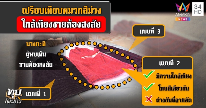 เมื่อนำมาเปรียบเทียบว่าจะมีความใกล้เคียงกับชายที่เป็นผู้ต้องสงสัย ตามคำกล่าวอ้างของนางกะทิ หรือไม่ นางกะทิ ยืนยันว่า แบบที่ 2 มีความใกล้เคียงมากที่สุด เพราะโทนสีเดียวกัน แต่จะมีความต่างกันที่ลายตัดเท่านั้น