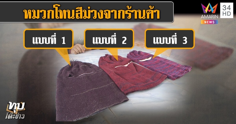 ได้สำรวจร้านค้า เเละร้านขายอุปกรณ์การเกษตร เริ่มจากร้านค้าที่อยู่ใกล้หมู่บ้านกกกอก คือหมู่บ้านกวนบุ่น พบว่ามีร้านที่ขายหมวกโม่งไหมพรม 2 ร้าน สำหรับหมวกโทนสีม่วงจากร้านค้ามี 3 แบบดังภาพข้างต้น