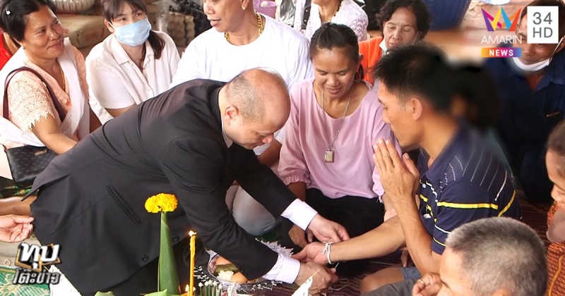 โดยผู้สูงอายุในหมู่บ้าน รวมถึงตาชาญ ย ายสมควร เเละเเขกผู้มาร่วมงาน ได้ผูกข้อไม้ข้อมือพ่อเเม่น้องชมพู่ น้องสะดิ้ง พร้อมทั้งมีการอวยพรให้หมดทุกข์หมดโศก ซึ่งอุ๊บ วิริยะ เเละทนายรัชพล ศิริสาคร ก็ร่วมผูกด้วย