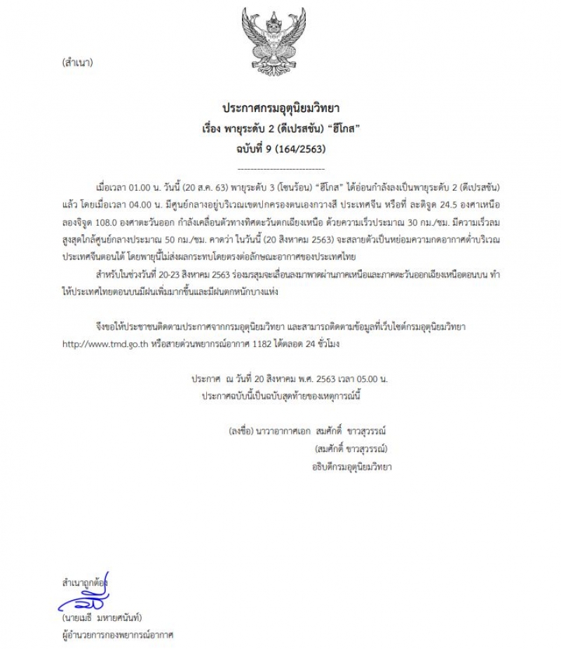 เมื่อเวลา 01.00 น. วันนี้ (20 ส.ค. 63) กรมอุตุฯได้ออกมาเผยแผ่ประกาศเตือนฉบับที่ 9 พายุระดับ 3 (โซนร้อน) ฮีโกส ได้อ่อนกำลังลงเป็นพายุระดับ 2 (ดีเปรสชัน) แล้ว โดยเมื่อเวลา 04.00 น. มีศูนย์กลางอยู่บริเวณเขตปกครองตนเองกวางสี ประเทศจีน หรือที่ ละติจูด 24.5 องศาเหนือ ลองจิจูด 108.0 องศาตะวันออก กำลังเคลื่อนตัวทางทิศตะวันตกเฉียงเหนือ ด้วยความเร็วประมาณ 30 กม./ชม. มีความเร็วลมสูงสุดใกล้ศูนย์กลางประมาณ 50 กม./ชม. คาดว่าในวันนี้ (20 สิงหาคม 2563) จะสลายตัวเป็นหย่อมความกดอากาศต่ำบริเวณประเทศจีนตอนใต้ โดยพายุนี้ไม่ส่งผลกระทบโดยตรงต่อลักษณะ อากาศของประเทศไทย สำหรับในช่วงวันที่ 20-23 สิงหาคม 2563ร่องมรสุมจะเลื่อนลงมาพาดผ่านภาคเหนือและภาคตะวันออกเฉียงเหนือตอนบน ทำให้ประเทศไทยตอนบนมีฝนเพิ่มมากขึ้นและมีฝนตกหนักบางแห่ง