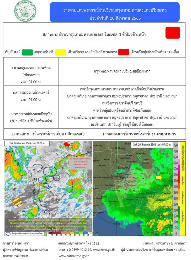 นอกจากนี้กรมอุตุ อากาศ 24 ชั่วโมงข้างหน้า ร่องมรสุมพาดผ่านภาคเหนือตอนบน เข้าสู่หย่อมความกดอากาศต่ำบริเวณประเทศเวียดนามตอนบน ประกอบกับมรสุมตะวันตกเฉียงใต้พัดปกคลุมทะเลอันดามันตอนบน ประเทศไทย และอ่าวไทย ลักษณะเช่นนี้ทำให้ภาคเหนือ ภาคตะวันออกเฉียงเหนือ และภาคตะวันออก มีฝนตกหนักบางแห่ง ขอให้ประชาชนที่อาศัยในพื้นที่เสี่ยงภัยบริเวณดังกล่าว ระวังอันตรายจากฝนตกหนักและฝนที่ตกสะสมซึ่งอาจทำให้เกิดน้ำท่วมฉับพลันและน้ำป่าไหลหลาก อนึ่ง ในช่วงวันที่ 20-23 สิงหาคม 2563 ร่องมรสุมจะเลื่อนลงมาพาดผ่านภาคเหนือ และภาคตะวันออกเฉียงเหนือตอนบนทำให้ประเทศไทยตอนบนมีฝนเพิ่มมากขึ้นและมีฝนตกหนักบางแห่ง