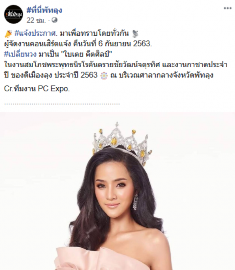 โดยทางเพจ แจ้งว่า แจ้งประกาศมาเพื่อทราบโดยทั่วกัน ผู้จัดงานคอนเสิร์ตแจ้งคืนวันที่ 6 ก.ย.2563 เปลี่ยนวงมาเป็น ใบเตย คีตศิลป์ ในงานสมโภชพระพุทธนิรโรคันตรายชัยวัฒน์จตุรทิศ และงานกาชาดประจำปี ของดีเมืองลุง ประจำปี 2563 ณ บริเวณศาลากลางจังหวัดพัทลุง