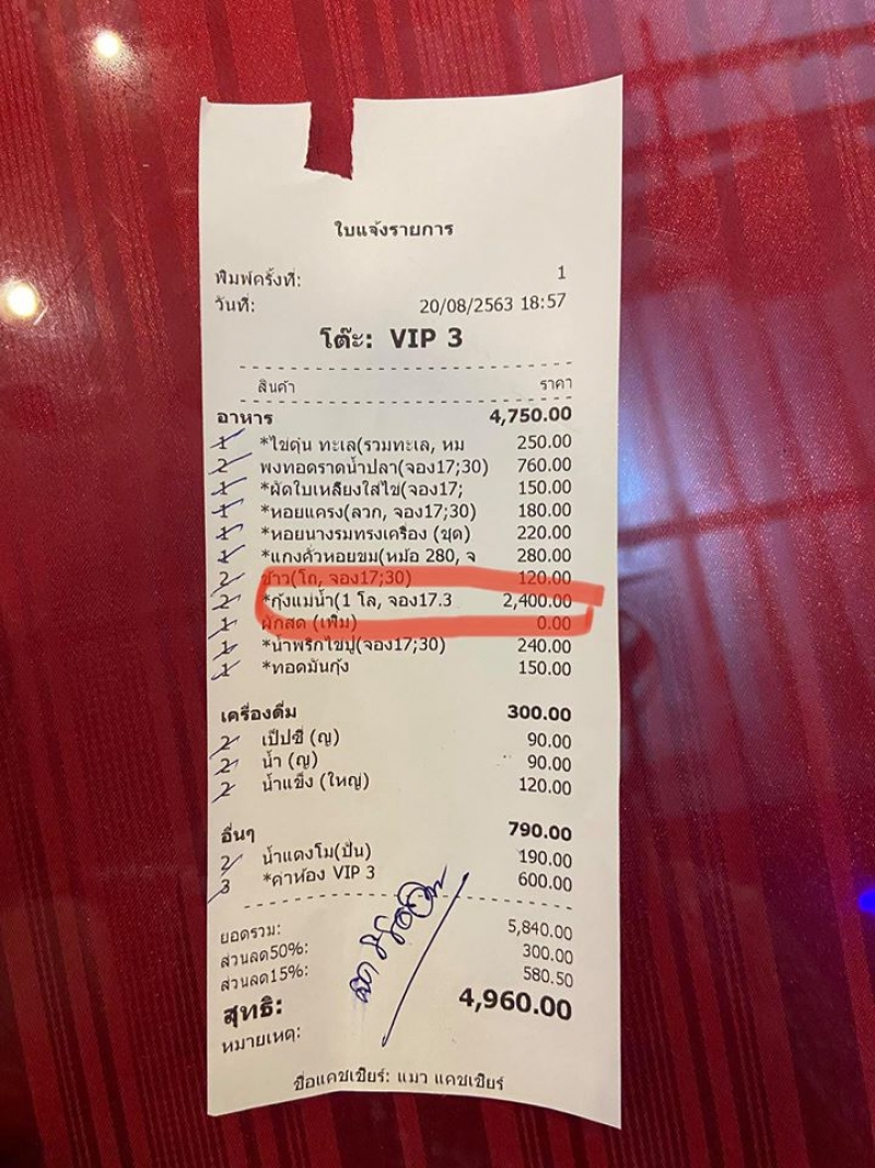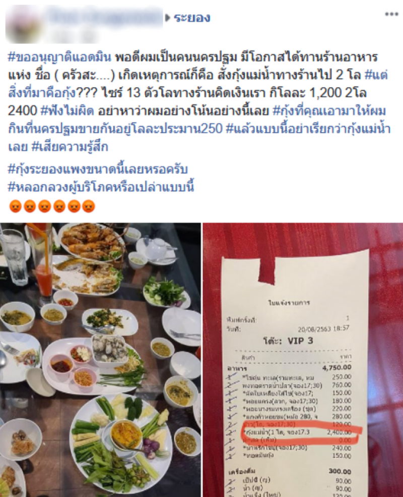 ขออนุญาติแอดมิน พอดีผมเป็นคนนครปฐม มีโอกาสได้ทานร้านอาหารแห่ง ชื่อ ( ครัวสะ....) เกิดเหตุการณ์ก็คือ สั่งกุ้งแม่น้ำทางร้านไป 2 โล แต่สิ่งที่มาคือกุ้ง ไซร์ 13 ตัวโลทางร้านคิดเงินเรา กิโลละ 1,200 2โล 2400 ฟังไม่ผิด อย่าหาว่าผมอย่างโน้นอย่างนี้เลย กุ้งที่คุณเอามาให้ผมกินที่นครปฐมขายกันอยู่โลละประมาน250 แล้วแบบนี้อย่าเรียกว่ากุ้งแม่น้ำเลย เสียความรู้สึก