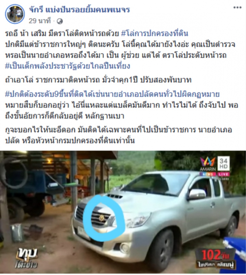 ล่าสุดเมื่อวันที่ 22 สิงหาคม เพจ จักรี แบ่งปันรอยยิ้มคนพเนจร ได้โพสต์ข้อความระบุว่า รถน้า เสริม มีตราโล่ติดหน้ารถด้วย โล่การปกครองที่ดิน ปกติมีแต่ข้าราชการใหญ่ๆ ติดนะครับ โล่นี้คุณได้มายังไงอ่ะ คุณเป็นตำรวจหรอเป็นนายอำเภอหรอถึงได้มา เป็น ผู้ช่วย แต่ได้ ตราโล่ประดับหน้ารถ เป็นเด็กพลังประชารัฐด้วย ถ้าเอาโล่ ราชการมาติดหน้ารถ มั่วโทษ1ปี ปรับสองพันบาท ปกติต้องระดับ 9 ขึ้นที่ติดได้เช่นนายอำเภอปลัดคนทั่วไปผิดกฏหมาย หมายสืบก็บอกอยู่ว่า นี่แหละแต่แบล็คมันดีมาก ทำไรไม่ได้ ถึงจับไป พอถึงชั้นอัยการก็กลับอยู่ดี หลักฐานเบา จะบอกไรให้นะ มันติดได้เฉพาะคนที่ไปเป็นข้าราชการ นายอำเภอปลัด หรือหัวหน้ากรมปกครองที่ดินเท่านั้น