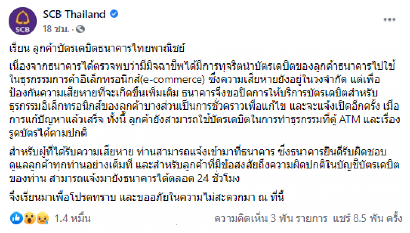ด่วน ปิดบริการบัตรเดบิต ธนาคารไทยพาณิชย์ ช่องทางออนไลน์ เหตุ ตรวจพบช่องโหว่ มิจฉาชีพนำไปใช้ เตือนลูกค้าโปรดระวัง หากเกิดสิ่งผิดสังเกต ให้รีบแจ้งทางธนาคาร เนื่องจากพบว่ามีมิจฉาชีพได้มีการทุจริตนําบัตรเดบิตของลูกค้าธนาคารไปใช้ในธุรกรรมการค้าอิเล็กทรอนิกส์ โดยทางธนาคารออกมาแจ้งว่า