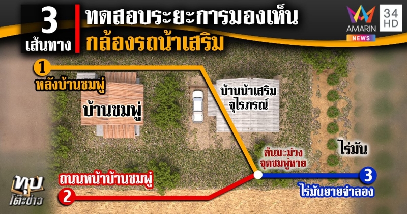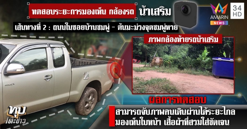 ต่อมาทีมข่าวได้นำผ้ามาตากไว้ที่ราว และเดินผ่านอีกครั้ง ก็พบว่ากล้องก็จะสามารถบันทึกและเห็นการเดินผ่านได้ หลังจากนั้นทีมข่าวได้จำลองเดินบนถนนในซอยบ้านของน้องชมพู่ พบว่ากล้องหลังสามารถบันทึกและเห็นทีมข่าวได้เพียงเล็กน้อย เนื่องจากตรงกับท้ายรถนั้นมีพุ่มไม้บังอยู่ ซึ่งน้าต่ายก็ให้ข้อมูลในช่วงที่น้องชมพู่หายไปพุ่มไม้ก็มีความสูงประมาณ 1 เมตร ซึ่งเท่ากับในตอนนี้