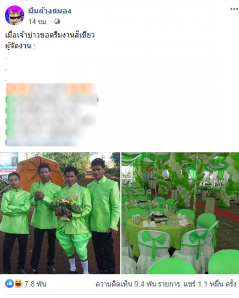 เรียกได้ว่าเป็นอีกหนึ่งเรื่องราวที่โซเชียลเข้ามาแสดงความเห็น กันเป็นจำนวนมาก หลังมีผู้ใช้เฟสบุ๊ครายหนึ่งได้ออกมาโพสต์ภาพงานแต่งงานที่หนึ่ง งานนี้เต็มไปด้วยสีเขียว เพราะจัดงานในธีมสีเขียวนั่นเองจ่า งานนี้รวมไปถึงชุดเจ้าบ่าวก็มีสีเขียวสดใส เช่นเดียวกันจ้า งานนี้ผู้ใช้เฟสบุ๊คดังกล่าวยังได้ระบุข้อความว่า