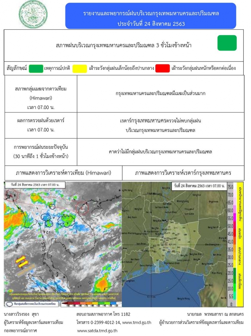 วันที่ 24 ส.ค. กรมอุตุฯ อากาศ 24 ชั่วโมงข้างหน้า ร่องมรสุมพาดผ่านตอนบนของภาคเหนือและภาคตะวันออกเฉียงเหนือ ประกอบกับมรสุมตะวันตกเฉียงใต้ยังคงพัดปกคลุมทะเลอันดามัน และประเทศไทยลักษณะเช่นนี้ทำให้มีฝนตกหนักบางพื้นที่บริเวณภาคเหนือ ภาคตะวันออกเฉียงเหนือ ภาคกลาง และภาคตะวันออก ขอให้ประชาชนที่อาศัยในพื้นที่เสี่ยงภัยบริเวณภาคเหนือ และภาคตะวันออกเฉียงเหนือ ระวังอันตรายจากฝนที่ยังคงตกหนัก ซึ่งทำให้เกิดน้ำท่วมฉับพลันและน้ำป่าไหลหลากได้ฝุ่นละอองขนาดเล็ก เนื่องจากขณะนี้ประเทศไทยมีฝนตกต่อเนื่อง ดังนั้นการเกิดหรือการสะสมของฝุ่นละออง/หมอกควัน ไม่มีหรือมีน้อย