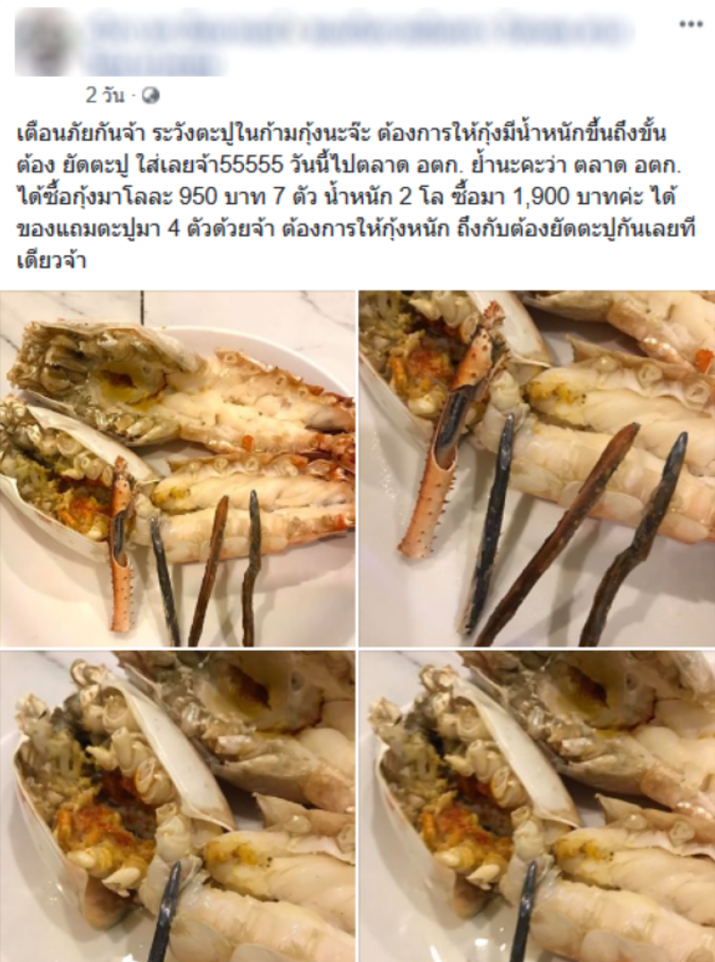 โดยผู้โพสต์ระบุว่า เตือนภัยกันจ้า ระวังตะปูในก้ามกุ้งนะจ๊ะ ต้องการให้กุ้งมีน้ำหนักขึ้นถึงขั้นต้อง ยัดตะปู ใส่เลยจ้า55555 วันนี้ไปตลาด อตก. ย้ำนะคะว่า ตลาด อตก. ได้ซื้อกุ้งมาโลละ 950 บาท 7 ตัว น้ำหนัก 2 โล ซื้อมา 1,900 บาทค่ะ ได้ของแถมตะปูมา 4 ตัวด้วยจ้า ต้องการให้กุ้งหนัก ถึงกับต้องยัดตะปูกันเลยทีเดียวจ้า