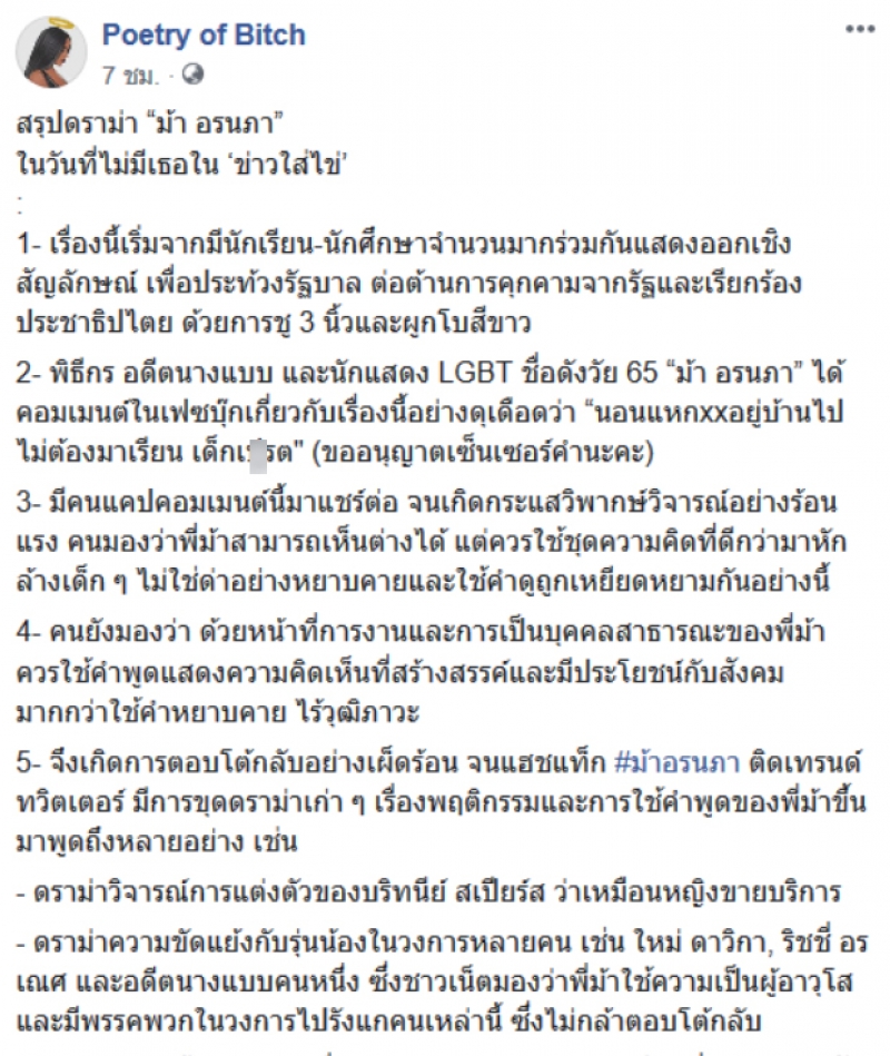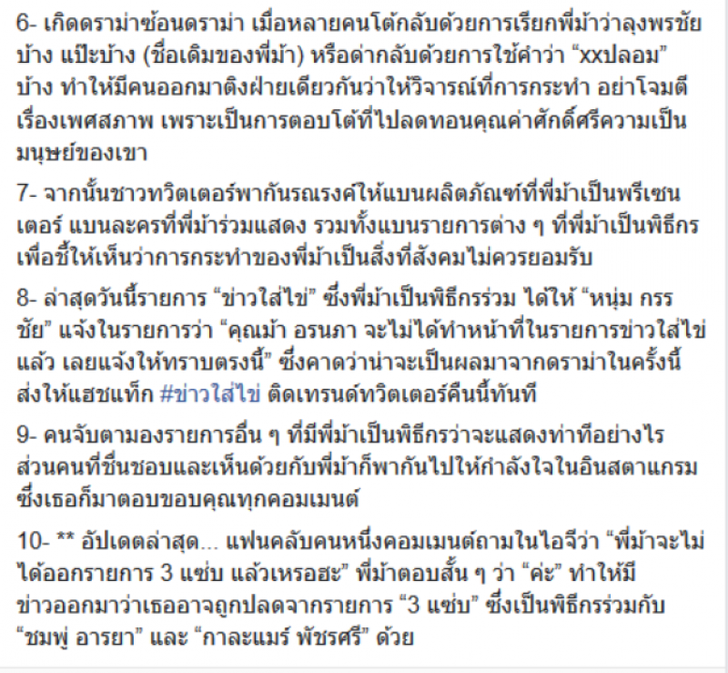 อย่างที่หลายคนทราบกันดีแล้วว่า ม้า อรนภา ได้ยุติการทำหน้าที่พิธีกรแล้ว เรื่องราวที่นำมาสู่การปลดหน้าที่พิธีกรนี้มาจากเรื่องอะไร วันนี้เราจะมาไล่เรียงให้เข้าใจกันครับ เมื่อวันที่ 24 สิงหาคม เพจ Poetry of Bitch ได้สรุปใจความไว้ดังนี้ สรุปดราม่า ม้า อรนภา ในวันที่ไม่มีเธอใน ข่าวใส่ไข่