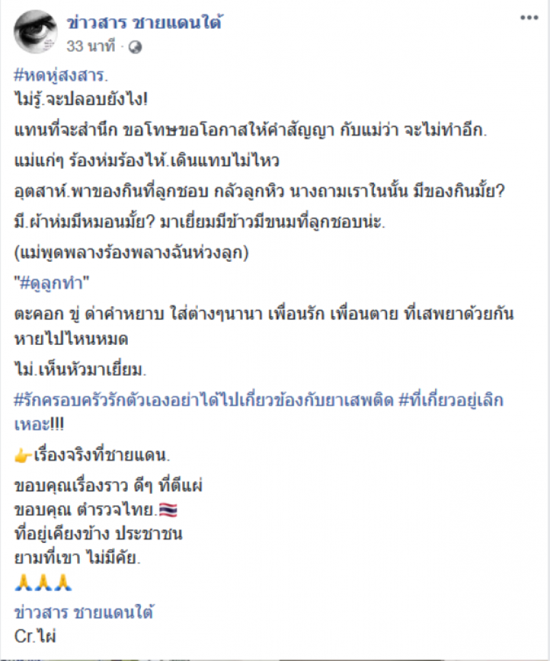 เมื่อวันที่ 25 สิงหาคม เพจ ข่าวสาร ชายแดนใต้ ได้โพสต์ข้อความระบุว่า หดหู่สงสาร ไม่รู้ จะปลอบยังไง แทนที่จะสำนึก ขอโทษขอโอกาสให้คำสัญญา กับแม่ว่า จะไม่ทำอีก เป็นภาพที่น่าเศร้าใจยิ่งนักอยากให้ลู กทุกคนได้เห็นภาพนี้ แล้วจะรู้ว่าแม่รักเราแค่ไหน ไม่ว่าเราจะดีจะร้า ย