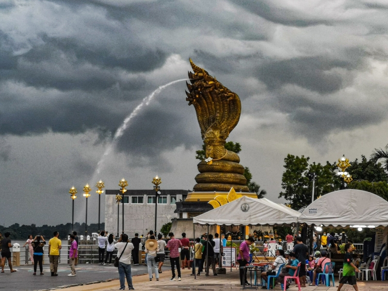 เป็นภาพที่เห็นแล้วรู้สึกเหมือนมีมนต์ขลังอะไรสักอย่าง ด้วยรูปปั้นขององค์พญานาคและบรรยากาศ ที่เกิดปรากฏการณ์ธรรมชาติ เมฆก่อตัวเป็นกลุ่มก้อน เนื่องจากช่วงนี้มีพายุฝน ภาพนี้ถูกถ่ายเมื่อ วันที่ 24 สิงหาคม 2563 เวลาประมาณ 18.00 น. ไปชมกันว่าสวยขนาดไหน