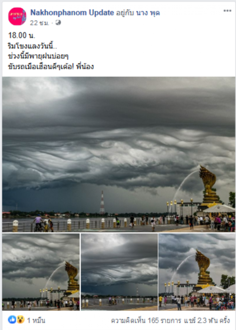เรียกได้ว่าเป็นอีกหนึ่งเรื่องราวที่โซเชียลเข้ามาแสดงความคิดเห็น และให้ความสนใจกันเป็นจำนวนมาก หลังเพจเฟสบุ๊ค Nakhonphanom Update ได้ออกมาโพสต์ภาพพร้อมทั้งได้ระบุข้อความว่า 18.00 น. ริมโขงแลงวันนี้ ช่วงนี้มีพายุฝนบ่อยๆ ขับรถเมือเฮือนดีๆเด้อ พี่น้อง