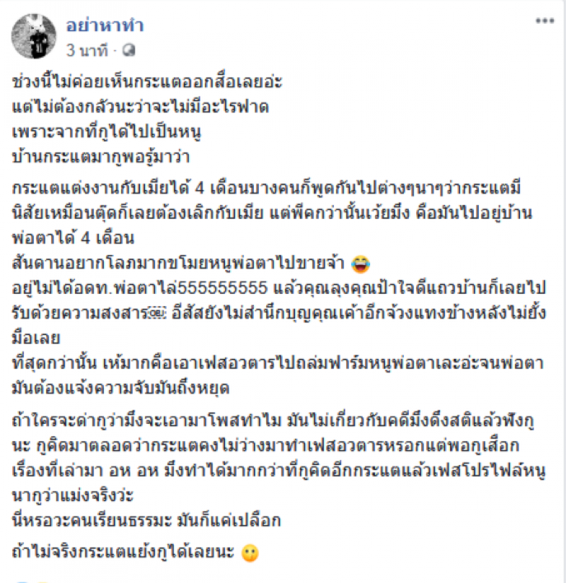 เมื่อวันที่ 27 สิงหาคม 63 เพจ อย่าหาทำ ได้โพสต์ข้อความระบุว่า ช่วงนี้ไม่ค่อยเห็นกระแตออกสื่อเลยอ่ะ แต่ไม่ต้องกลัวนะว่าจะไม่มีอะไรเล่น เพราะจากที่ได้ไปเป็นหนู บ้านกระแตมาพอรู้มาว่า กระแตแต่งงานกับได้ 4 เดือนบางคนก็พูดกันไปต่าง ๆ นา ๆ ว่ากระแตมีนิสัยเหมือนผู้ชาย ก็เลยต้องเลิก แต่พีคกว่านั้น คือมันไปอยู่บ้านพ่อตาได้ 4 เดือน