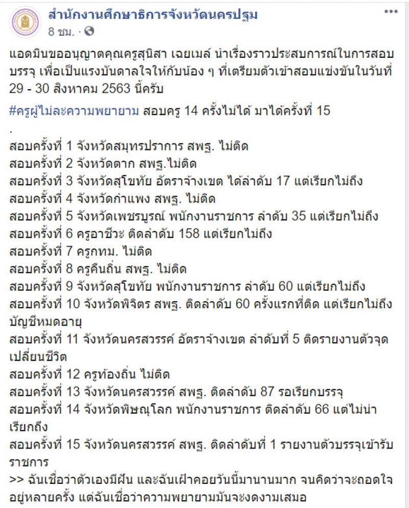 เรียกได้ว่าเป็นอีกหนึ่งเรื่องราวที่โซเชียลเข้ามาแสดงความเห็นกันเป็นจำนวนมาก หลังมีผู้ใช้เฟสบุ๊คชื่อ สำนักงานศึกษาธิการจังหวัดนครปฐม ได้ออกมาโพสต์เรื่องราวโดยได้ระบุข้อความว่า คุณครูสาว ชื่อ สุนิสา เฉลเมล์ ผู้ใช้เฟซบุ๊กชื่อ Mabiwty sunisa ครูผู้ช่วยโรงเรียนอนุบาลไพศาลี อ.ไพศาลี จ.นครสวรรค์ ที่สามารถสอบข้าราชการสำเร็จ หลังจากใช้ความพยายามสอบมาถึง 15 ครั้ง