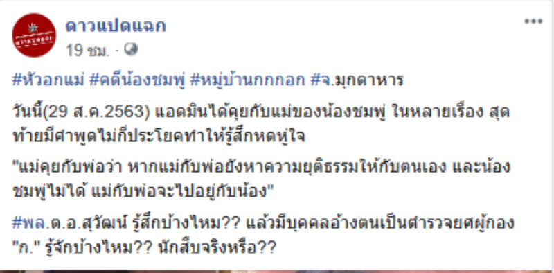 ล่าสุด เมื่อวันที่ 29 สิงหาคม เพจ ดาวแปดแฉก ได้โพสต์ข้อความระบุว่า หัวอกแม่ คดีน้องชมพู่ หมู่บ้านกกกอก จ.มุกดาหาร วันนี้ 29 ส.ค.2563 แอดมินได้คุยกับแม่ของน้องชมพู่ ในหลายเรื่อง สุดท้ายมีคำพูดไม่กี่ประโยคทำให้รู้สึกหดหู่ใจ แม่คุยกับพ่อว่า หากแม่กับพ่อยังหาความยุติธรรมให้กับตนเอง และน้องชมพู่ไม่ได้ แม่กับพ่อจะไปอยู่กับน้อง พล.ต.อ.สุวัฒน์ รู้สึกบ้างไหม แล้วมีบุคคลอ้างตนเป็นตำรวจยศผู้กอง ก. รู้จักบ้างไหม นักสืบจริงหรือ