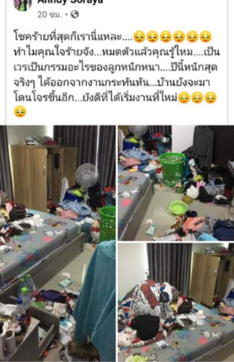 เมื่อวันที่ 29 สิงหาคม ผู้ใช้เฟสบุ๊ครายหนึ่งได้โพสต์ข้อความระบุว่า ขโมยขึ้นบ้าน โชคร้ายที่สุดก็เรานี่แหละ ทำไมคุณใจร้ายจัง หมดตัวแล้วคุณรู้ไหม เป็นเวรเป็นกรรมอะไรของลูกหนักหนา ปีนี้หนักสุดจริงๆ ได้ออกจากงานกระทันหัน บ้านยังจะมาโดนโจรขึ้นอีก ยังดีที่ได้เริ่มงานที่ใหม่