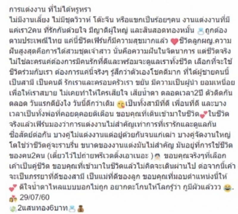 เรียกได้ว่าเป็นอีกหนึ่งเรื่องราวที่โลกออนไลน์เข้ามาแสดงความเห็น กันเป็นจำนวนมาก หลังมีผู้ใช้เฟสบุ๊ครายหนึ่งได้ออกมาโพสต์เรื่องราว ตนกับแฟน โดยได้ระบุข้อความว่า การแต่งงาน ที่ไม่ได้หรูหรา ไม่มีงานเลี้ยง ไม่มีชุดวิวาห์ โต๊ะจีน หรือแขกเป็นร้อยๆคน งานแต่งงานที่มีแค่เรา2คน ที่รักกันด้วยใจ มีญาติผู้ใหญ่ และสินสอดทองหมั้น ถูกต้องตามประเพณีไทย แค่นี้ชีวิตเฟิร์นก็มีความสุขมากแล้ว ชีวิตลูกผญ.ความฝันสูงสุดคือการได้สวมชุดเจ้าสาว นั่นคือความฝันในจิตนาการ