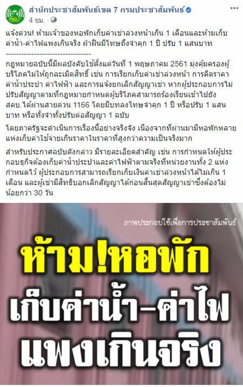 วันที่ 31 สิงหาคม 2563 เพจเฟซบุ๊ก สำนักประชาสัมพันธ์เขต 7 กรมประชาสัมพันธ์ แจ้งเตือนถึงทุกหอพักห้ามเก็บค่าเช่าล่วงหน้าเกิน 1 เดือน และห้ามเก็บค่าน้ำค่าไฟแพงเกินความเป็นจริง ฝ่าฝืนมีโทษทางกฎหมาย ระบุรายละเอียด