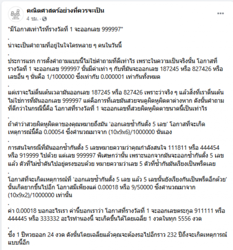 นั่นคือ ค่า 0.00018 บอกเราว่า โอกาสที่รางวัลที่ 1 จะออกเลขตระกูล 911111 หรือ 444445 หรือ 333332 อะไรทำนองนี้ จะเกิดขึ้นได้โดยเฉลี่ย 1 รอบในทุก 5,556 รอบ ซึ่ง 1 ปี เลขออก 24 รอบ ดังนั้นโดยเฉลี่ยแล้วคุณจะต้องรอไปอีกราว 232 ปี ถึงจะเกิดเหตุการณ์แบบนี้อีก นับว่าวันนี้ เราทุกคนได้เป็นส่วนหนึ่งของเหตุการณ์ประวัติศาสตร์นี้ร่วมกัน