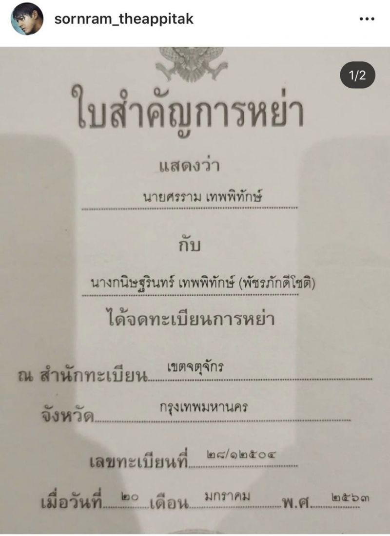 เรียกได้ว่าทำเอาแฟนๆ ตกใจกนหนักมากเลยก็ว่าได้ หลัง หนุ่ม ศรราม ได้ออกมาโพสต์ภาพใบหย่า ที่หย่าขาดกับภรรยา พร้อมทั้งได้ระบุข้อความว่า เนื่องจากในระยะ 2-3 สัปดาห์ที่ผ่านมามีบุคคลมาตามหาคุณติ้กที่บ้านและโทรศัพท์มาหาผมหลายครั้ง ซึ่งผมเองก็ทำงานเกือบทุกวัน จึงขอความกรุณาผู้ใดก็ตามที่ได้ทำสัญญาหรือทำธุรกรรมทางด้านการเงินหรือด้านต่างๆ กับคุณ ติ้ก กนิษฐ์รินทร์ พัชรภักดีโชติ ช่วยติดต่อกับคุณติ้กโดยตรงและไม่ต้องมาที่บ้านผมกับลูก เพราะผมกับลูกไม่ทราบเรื่องใดๆ ทั้งสิ้น