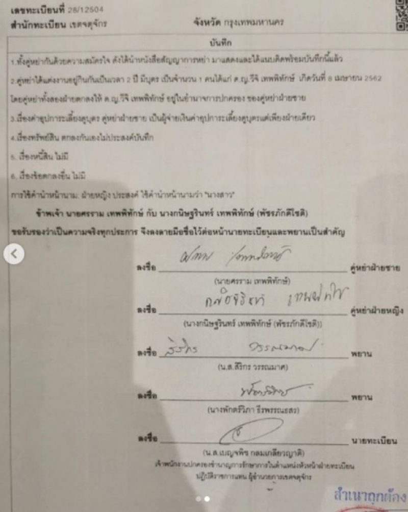 โดยในใบหย่านั้นพบว่าระบุวันที่เซ็นหย่าในวันที่ 20 มกราคม 2563 ที่ผ่านมา นอกจากนี้ยับพบข้อตกลงไว้ว่า โดยคู่หย่าทั้งสองฝ่ายตกลงให้ ด.ญ.วีจิ เทพพิทักษ์ อยู่ในอำนาจการปกครองของคู่หย่าฝ่ายชาย เรื่องค่าอุปการะเลี้ยงดูบุตร คู่หย่าฝ่ายชาย เป็นผู้จ่ายในค่าอุปการะเลี้ยงดูบุตรเพียแต่ฝ่ายเดียว