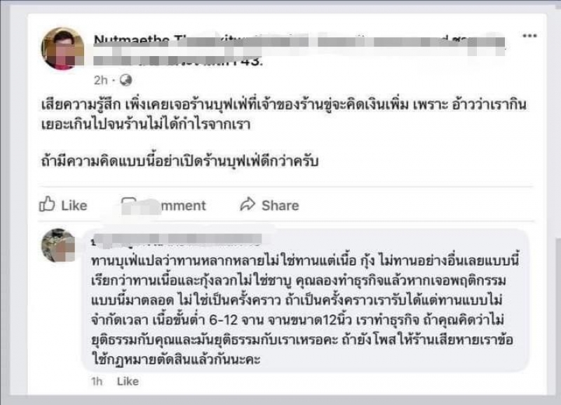 กรณีที่เกิดขึ้นตนมองว่าอาจจะมีผลกระทบต่อแบรนด์ของชาบูนางใน รวมถึงสาขาอื่นๆ ดังนั้นก็อยากให้ลูกค้าเข้าใจว่าเหตุที่เกิดมาจากสาขาไหน ตามหลักลูกค้าที่เข้ามาทานบุฟเฟ่ต์นั้นคือใครอยากจะรับประทานอะไรก็ตามใจชอบ สั่งเท่าไหร่ก็สุดอยู่ที่ลูกค้าจะอิ่มเท่านั้น พร้อมยืนยันว่าทางชาบูนางในไม่มีนโยบายให้เก็บเงินลูกค้าเพิ่มหากว่ามีการรับประทานอาหาร ในส่วนที่เป็นราคาสูง