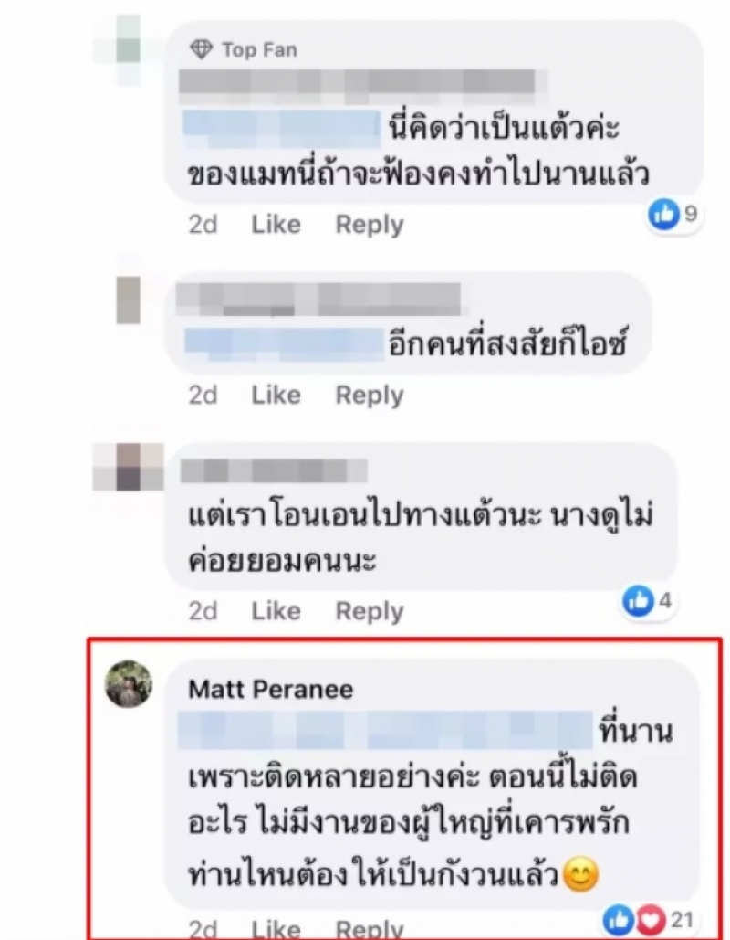ล่าสุด ชาวเน็ตต่างพุ่งเป้าไปที่ แมท ภีรนีย์ เนื่องจากพบว่ามีเฟซบุ๊คชื่อ Matt Peranee ที่เป็นของสาวแมทได้คอมเมนต์ใต้โพสต์ของทนายนิด้าว่า ที่นานเพราะติดหลายอย่างค่ะ ตอนนี้ไม่ติดอะไร ไม่มีงานของผู้ใหญ่ที่เคารพรักท่านไหนต้องให้เป็นกังวลแล้ว