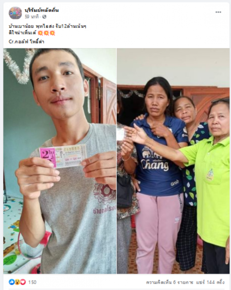 ล่าสุดเพจ บุรีรัมย์พลัดถิ่น โพสต์ภาพผู้โชคดีชาวบุรีรัมย์ บ้านเบาน้อย อ.พุทไธสง จ.บุรีรัมย์ ถูกลอตเตอรี่รางวัลที่ 1 ถึง 2 ใบ รับเงิน 12 ล้านบาท ก่อนลงภาพในเฟซบุ๊ก จากนั้นเมื่อครอบครัวทราบข่าวก็ต่างมาร่วมแสดงความยินดี จากนั้นเตรียมนำสลากกินแบ่งรัฐบาล 12 ล้านนี้ไปขึ้นเงินกับสำนักงานสลากกินแบ่งรัฐบาล