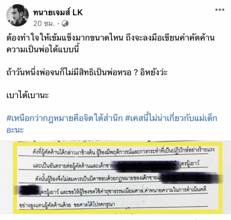 ทั้งนี้ ทนายเจม์ได้ระบุแคปชั่นแสดงความเห็นส่วนตัวว่า ต้องทำใจให้เข้มแข็งมากขนาดไหน ถึงจะลงมือเขียนคำคัดค้านความเป็นพ่อได้แบบนี้ ถ้าวันหนึ่งพ่อจนก็ไม่มีสิทธิเป็นพ่อหรอ อิหยังว่ะ เบาได้เบานะ #เหนือกว่ากฎหมายคือจิตใต้สำนึก #เคสนี้ไม่น่าเกี่ยวกับแม่เด็กอะนะ
