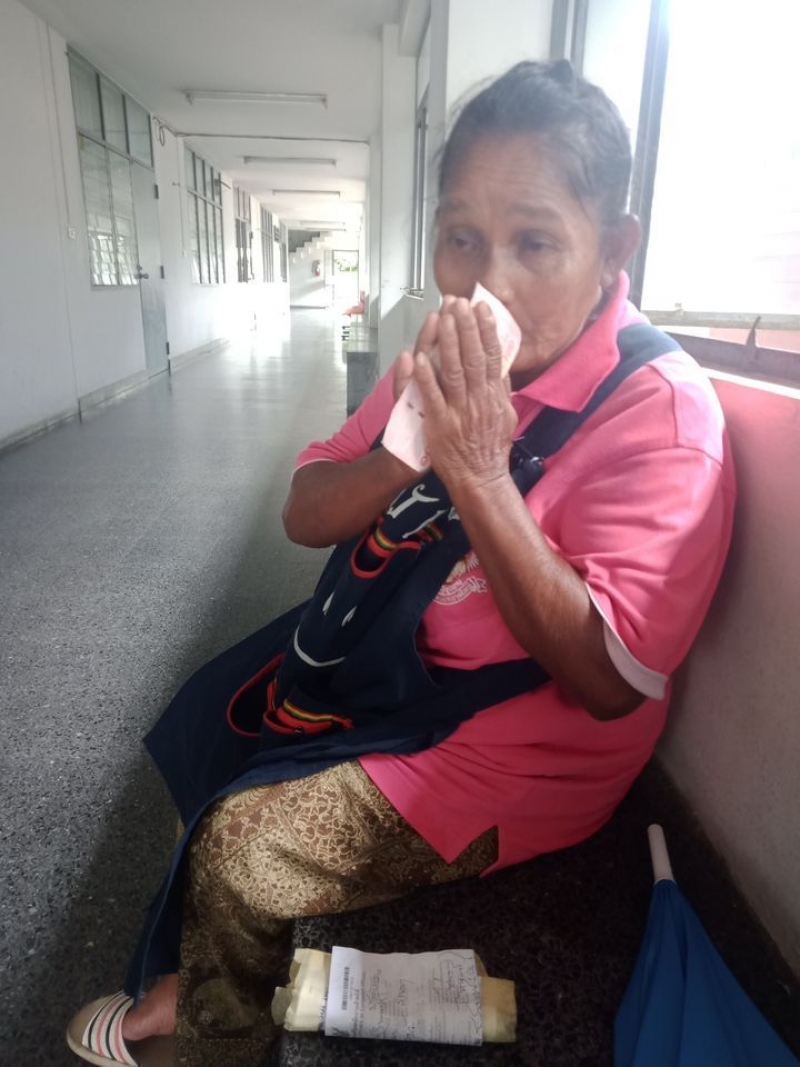คือว่าผมไปเสียค่าปรับเลยพบยายคนนี่ยายเรียกผมก่อนเข้าห้องเสียค่าปรับผมเลยเดินไปหายาย ยายถามว่ายายขอเบี้ยสัก 50 บาท ได้ไหมถึงผมบอกยายไปว่าเอาแบบนี่นะยายผมไม่รู้ว่าค่าปรับเท่าไหร่เดี๋ยวผมเข้าไปเคลียค่าปรับก่อนเดียวผมออกมาหายายพอเสียค่าปรับเสร็จผมก็เดินมาหายาย ยายก็เล่าให้ฟังว่ายายมาโรงบาลจำไม่ได้ว่ายายบอกว่าพาแฟนยายหรือใครมา อยู่โรงบาล 6 วันแล้ว