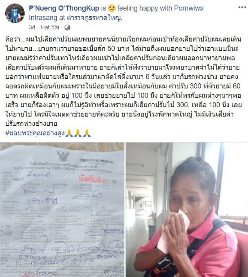 มากับรถพ่วงข้าง ยายคงจอดรถผิดเหมือนกับผมเพราะในมือยายมีใบสั่งเหมือนกับผม ค่าปรับ 300 ที่ตัวยายมี 60 บาท ผมเหลือติดตัว อยู่ 100 นึง เลยช่วยยายไป 100 นึง ยายก็ให้พรกับผมต่างๆนาๆพอเสร็จ ยายก็ร้องเอาๆ ผมก็ไม่รู้เพราะผมก็เสียค่าปรับไป 300. เหลือ 100 นึง เลยให้ยายไป ใครมีใจเมตตาช่วยยายทีตะครับ ยายนั่งอยู่โรงพักหาดใหญ่ ไม่มีเงินเสียค่าปรับรถพ่วงข้างยาย ขอบพระคุณอย่างสูง