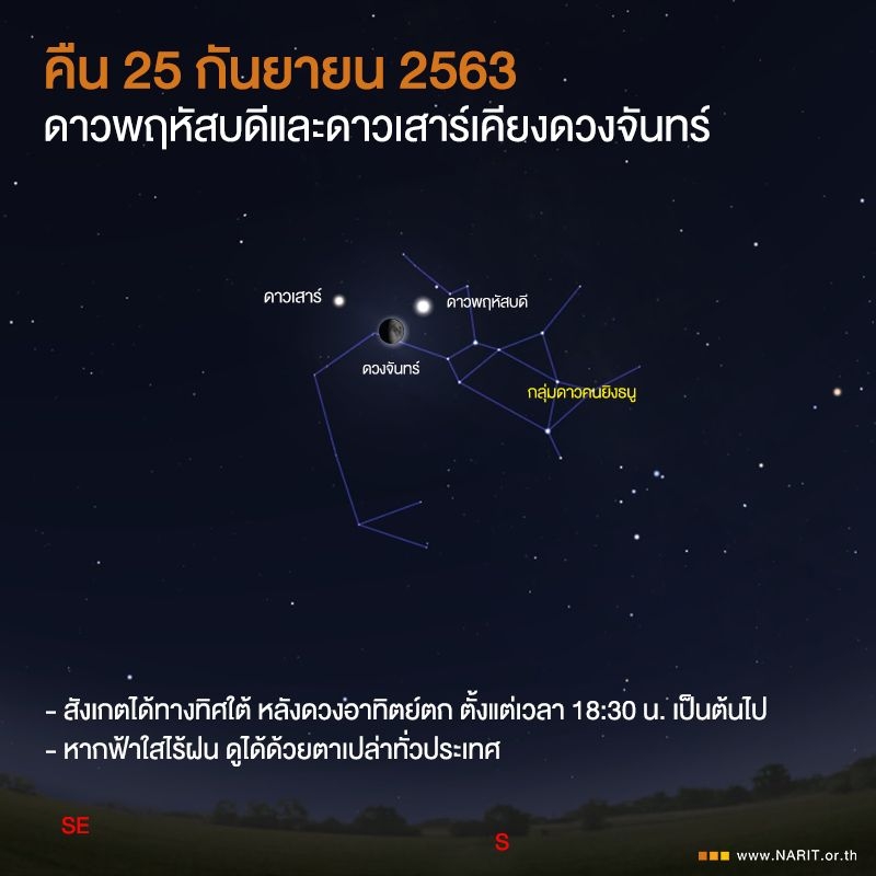 คืนนี้มี #ดาวเคียงเดือน 25 กันยายน 2563 ดาวพฤหัสบดี และดาวเสาร์ เคียงดวงจันทร์ข้างขึ้น 9 ค่ำ ปรากฏบนท้องฟ้าทางทิศใต้หลังดวงอาทิตย์ตกลับขอบฟ้า ตั้งแต่เวลา 18:30 น. เป็นต้นไป