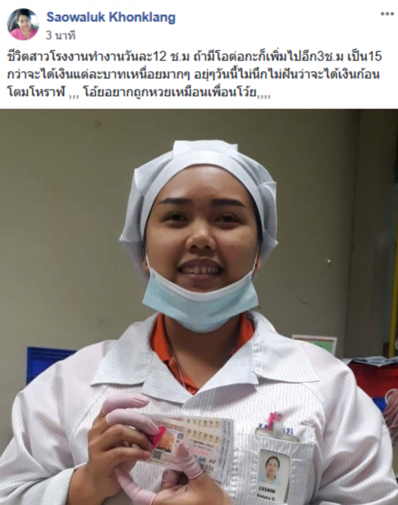 ล่าสุดมีารยงานว่า พบสาวโรงงาน ถูกสลากกินแบ่งรัฐบาล รางวัลที่ 1 ประจำวันที่ 1 ตุลาคม 2563 กับเลข 837893 โดยผู้ใช้เฟซบุ๊กชื่อ Saowaluk Khonklang ได้ระบุว่า ชีวิตสาวโรงงานทำงานวันละ12 ช.ม ถ้ามีโอต่อกะก็เพิ่มไปอีก3ช.ม เป็น15 กว่าจะได้เงินแต่ละบาทเหนื่อยมากๆ อยุ่ๆวันนี้ไม่นึกไม่ฝันว่าจะได้เงินก้อนโตมโหราฬ โอ้ยอยากถูกเหมือนเพื่อนโว้ย