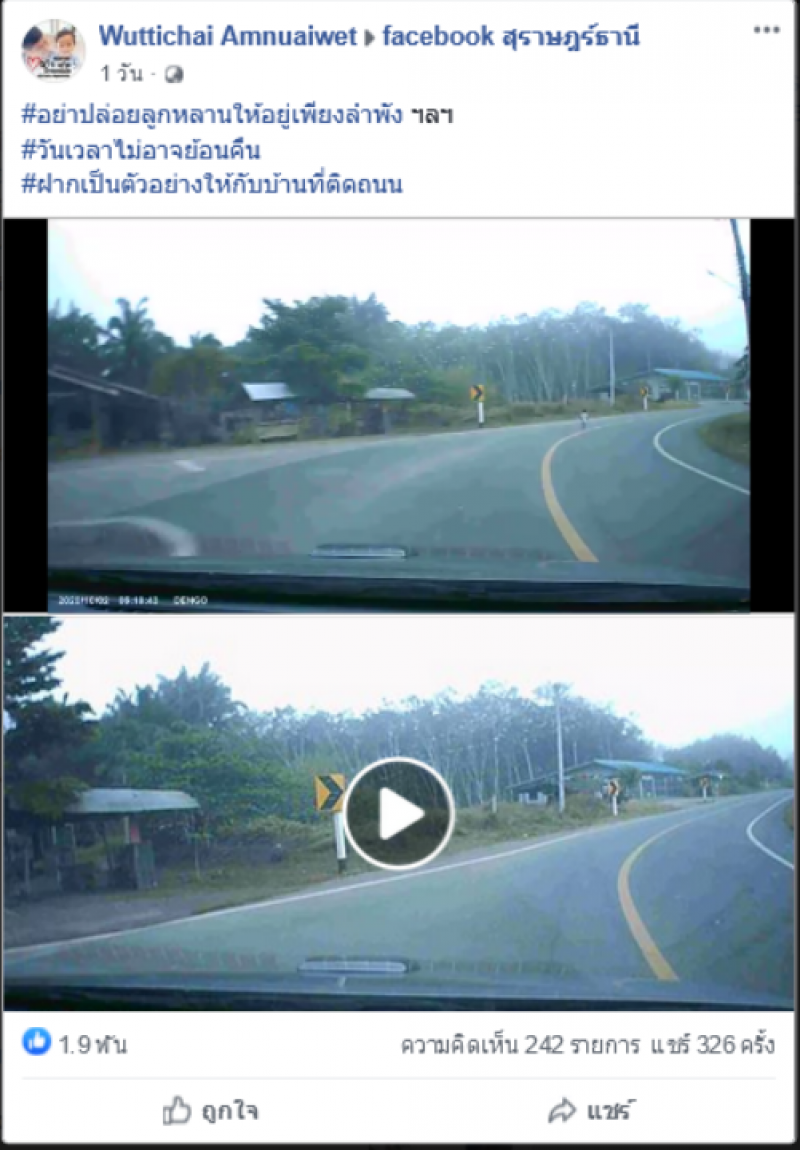 อย่าปล่อยลูกหลานให้อยู่เพียงลำพัง ฯลฯ วันเวลาไม่อาจย้อนคืน ฝากเป็นตัวอย่างให้กับบ้านที่ติดถนน พร้อมคลิปจากกล้องหน้ารถยนต์ ความยาวประมาณ 44 นาที ที่จู่ ๆ ก็ปรากฏภาพเด็กอายุราว 2 ขวบ ยืนอยู่กลางถนน ก่อนที่เจ้าของรถคันคันดังกล่าวจะจอดรถแล้วเดินไปอุ้มเด็กออกจากถนน ก่อนนำไปส่งให้กับผู้หญิงคนข้างที่ยืนรออยู่ริมถนน ซึ่งปรากฏว่าได้รับความสนใจจากสังคมชาวโซเชียลเป็นอย่างมาก โดยส่วนใหญ่ตำหนิผู้ปกครองที่ไม่ดูแลเด็ก