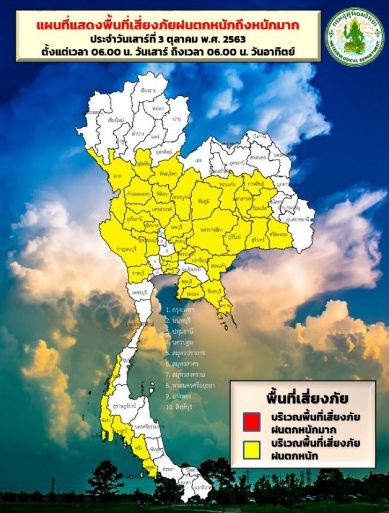 พยากรณ์อากาศ 24 ชั่วโมงข้างหน้า ร่องมรสุมพาดผ่านภาคกลาง และภาคตะวันออก ในขณะที่มรสุมตะวันตกเฉียงใต้ที่พัดปกคลุมทะเลอันดามัน ประเทศไทย และอ่าวไทย มีกำลังปานกลาง ทำให้ประเทศไทยยังคงมีฝนตกต่อเนื่อง และมีฝนตกหนักบางแห่งบริเวณภาคกลาง กรุงเทพมหานคร และปริมณฑล รวมทั้งภาคตะวันออก และภาคใต้ ขอให้ประชาชนที่อาศัยในพื้นที่เสี่ยงภัยบริเวณดังกล่าว ระวังอันตรายจากฝนที่ตกหนักและฝนที่ตกสะสมไว้ด้วย สำหรับคลื่นลมบริเวณทะเลอันดามันและอ่าวไทยมีกำลังปานกลาง โดยทะเลอันดามันตอนบนมีคลื่นสูงประมาณ 2 เมตร บริเวณอ่าวไทยตอนบน คลื่นสูง 1-2 เมตร ส่วนบริเวณที่มีฝนฟ้าคะนองคลื่นสูงมากกว่า 2 เมตร ขอให้ชาวเรือควรเดินเรือด้วยความระมัดระวัง และควรหลีกเลี่ยงบริเวณที่มีฝนฟ้าคะนอง