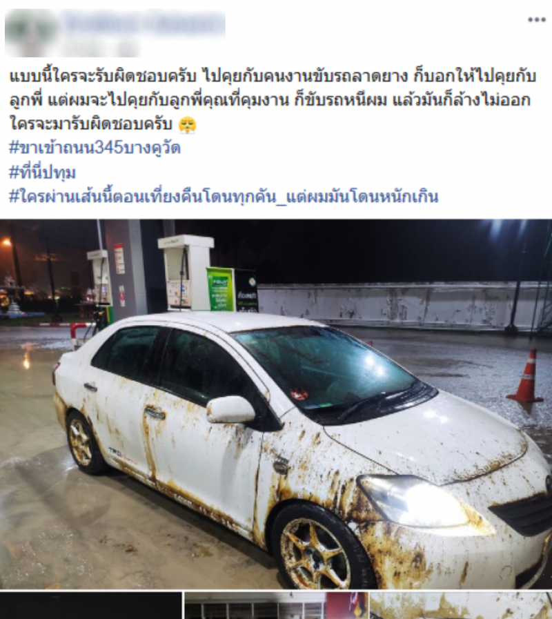 โดยผู้โพสต์ระบุว่า ระบุข้อความว่า แบบนี้ใครจะรับผิดชอบครับ ไปคุยกับคนงานขับรถลาดยาง ก็บอกให้ไปคุยกับลูกพี่ แต่ผมจะไปคุยกับลูกพี่คุณที่คุมงาน ก็ขับรถหนีผม แล้วมันก็ล้างไม่ออก ใครจะมารับผิดชอบครับ