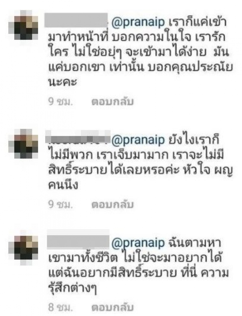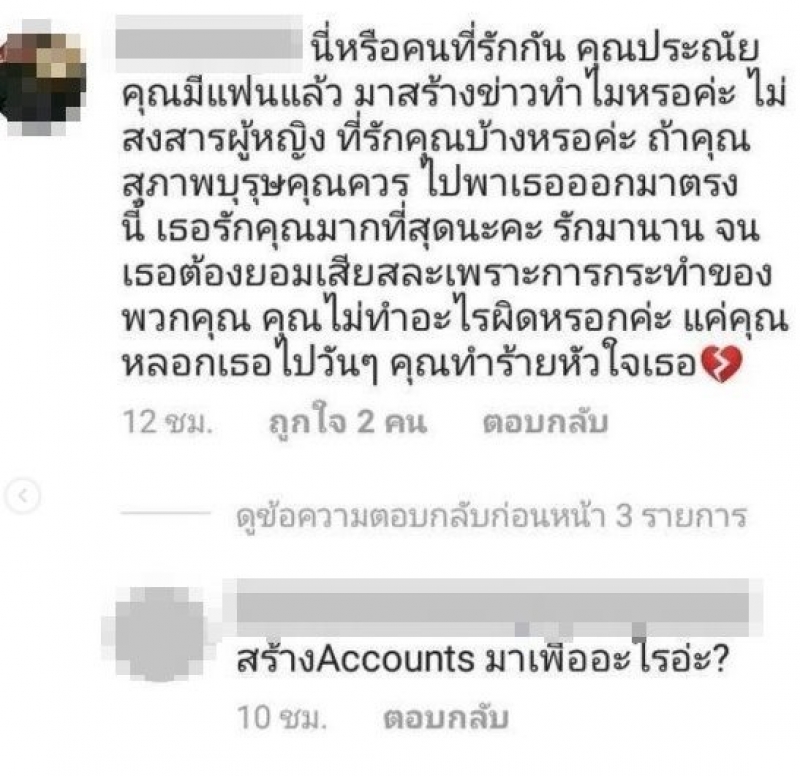 ทำเอาแฟนๆ แห่กดไลก์ คอมเมนต์แซวกันจำนวนมาก แต่จู่ๆกลับมีสาวปริศนาเข้ามาคอมเมนต์ใต้โพสต์ของหนุ่มประณัย ลักษณะว่า รักไฮโซณัย มีแฟนแล้ว มาสร้างข่าวทำไม ทำไมไม่ไปหาบ้าง