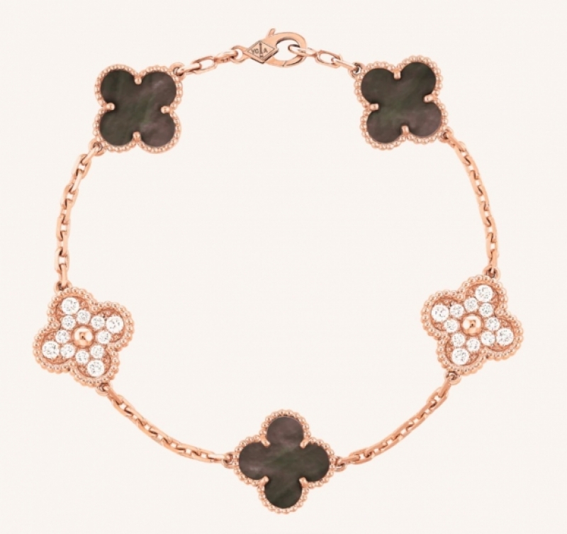 ทรงสวมนาฬิกาข้อพระหัตถ์ซ้าย สร้อยข้อมือรุ่น Vintage Alhambra ของแบรนด์ Van Cleef & Arpels ที่ข้อพระหัตถ์ขวา ราคา $12,800.00 หรือประมาณ 400,000 บาท