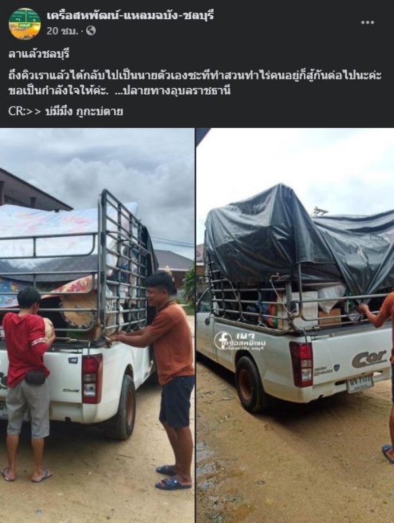 โดยผู้ใช้เฟซบุ๊กท่านนี้ยังโพสต์ข้อความระบุเอาไว้อีกว่า ลาแล้วชลบุรีถึงคิวเราแล้วได้กลับไปเป็นนายตัวเองซะทีทำสวนทำไร่คนอยู่ก็สู้กันต่อไปนะค่ะ ขอเป็นกำลังใจให้นะคะ ปลายทางอุบลราชธานี