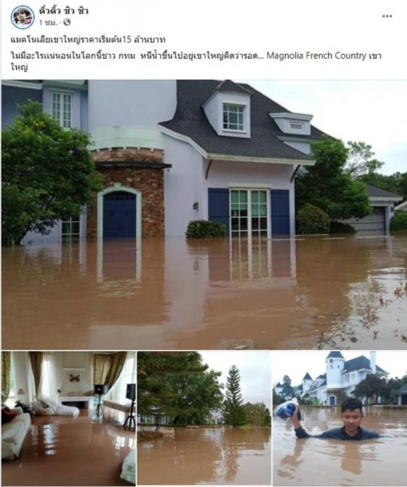 เรียกได้ว่าเป็นอีกหนึ่งเรื่องราวที่ดซเชียลเข้ามาแสดงความเห็น กันเป็นจำนวนมากหลังมีผู้ใช้เฟสบุ๊คชื่อ ติ๋วติ๋ว ชิว ชิว ได้ออกมาโพสต์ภาพซึ่งเป็นภาพความเสียหายของบ้านพักตากอากาศ โดยระบุว่า บ้านพักมีมูลค่า 15 ล้านบาท โดนน้ำป่าท่วมไปครึ่งหลัง โดนทำให้ภายในบ้านซึ่งตกแต่งไว้อย่างสวยงามไม่รอดจากน้ำท่วมครั้งนี้ไปได้ พร้อมทั้งระบุว่า โลกนี้ไม่มีอะไรแน่นอน หนีขึ้นไปอยู่เขาใหญ่ คิดว่าน้ำไม่ท่วมก็ยังท่วมได้