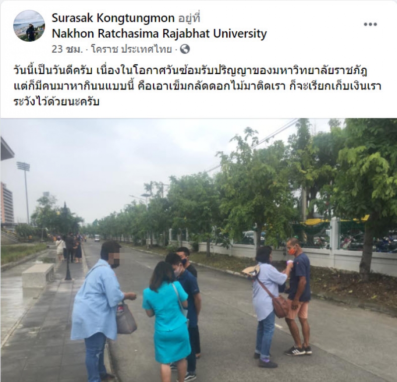 เป็นอีกหนึ่งเหตุการณ์ ที่โซเชียลเข้ามาแสดงความเห็น กันเป็นจำนวนมาก Surasak Kongtungmon ได้โพสต์เรื่องราวโดยระบุว่า วันนี้เป็นวันดีครับ เนื่องในโอกาศวันซ้อมรับปริญญาของมหาวิทยาลัยราชภัฎ แต่ก็มีคนมาหากินนแบบนี้ คือเอาเข็มกลัดดอกไม้มาติดเรา ก็จะเรียกเก็บเงินเรา ระวังไว้ด้วยนะครับ