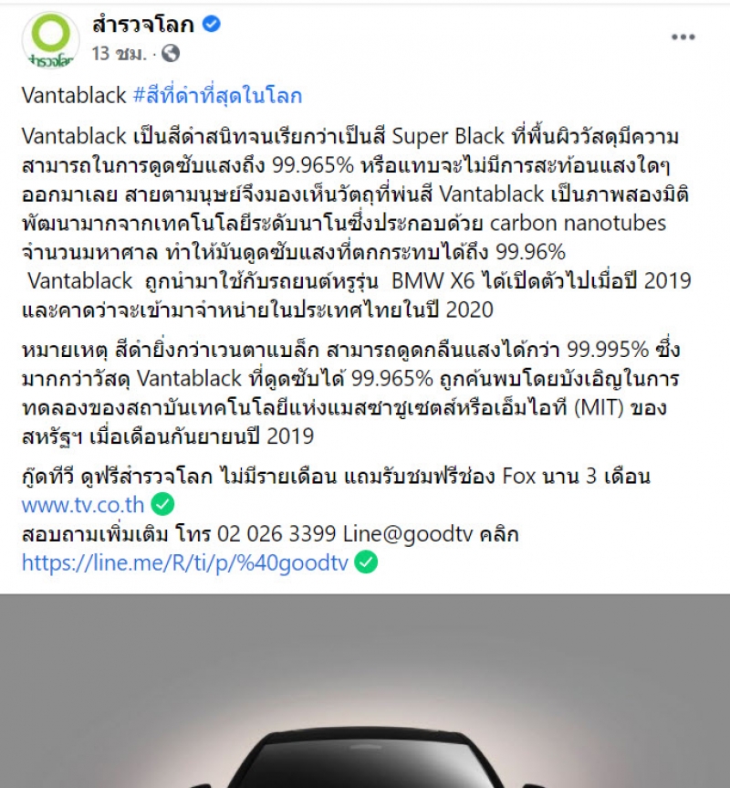 เรียกได้ว่าเป้นอีกหนึ่งภาพที่โซเชียลเข้ามาแสดงความเห้นกันเป็นจำนวนมาก เพจเฟสบุ๊ก สำรวจโลก ได้โพสต์ภาพ Vantablack สีดำที่ถูกนิยามว่าเป็นสีดำที่ดำที่สุดในโลก (blackest black) โดยระบุว่า