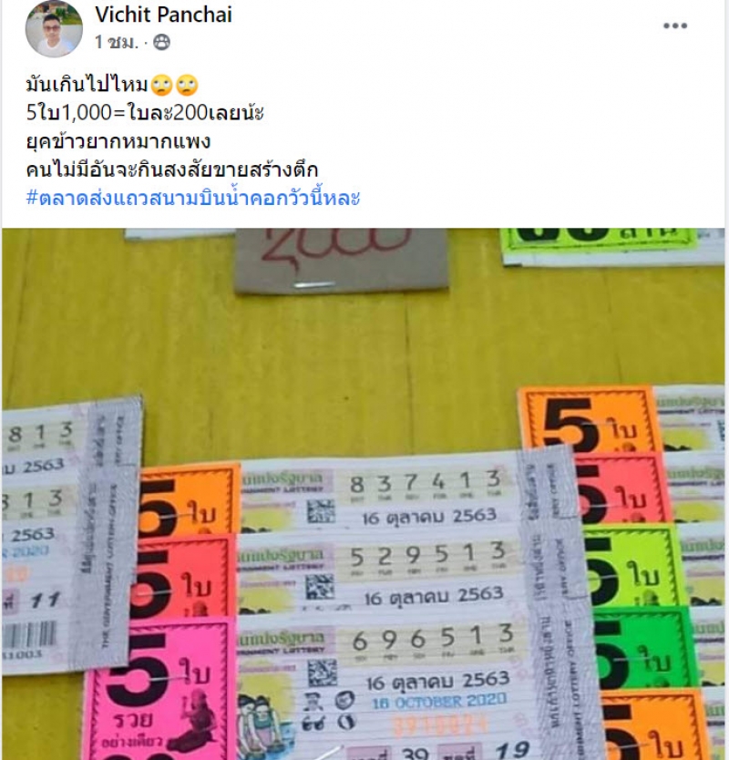 เมื่อผู้ใช้เฟซบุ๊กท่านหนึ่ง ได้เจอกับสลากกินแบ่งรัฐบาลขายแพงเกินราคา โดยจำหน่ายเป็นชุด ชุดละ 5 ใบ ราคา 1,000 บาท เท่ากับว่าขายราคาใบละถึง 200 บาทเลยทีเดียว โดยเจ้าของภาพ ได้ระบุว่า
