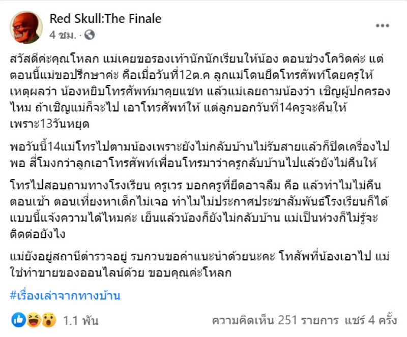 ตอนเที่ยงหาเด็กไม่เจอ ทำไมไม่ประกาศประชาสัมพันธ์โรงเรียนก็ได้ แบบนี้แจ้งความได้ไหมค่ะ เย็นแล้วน้องก็ยังไม่กลับบ้าน แม่เป็นห่วงก็ไม่รู้จะติดต่อยังไง แม่ยังอยู่สถานีตำรวจอยู่ รบกวนขอคำแนะนำด้วยนะคะ โทสัพที่น้องเอาไป แม่ใช่ทำขายของออนไลน์ด้วย ขอบคุณค่ะโหลก #เรื่องเล่าจากทางบ้าน