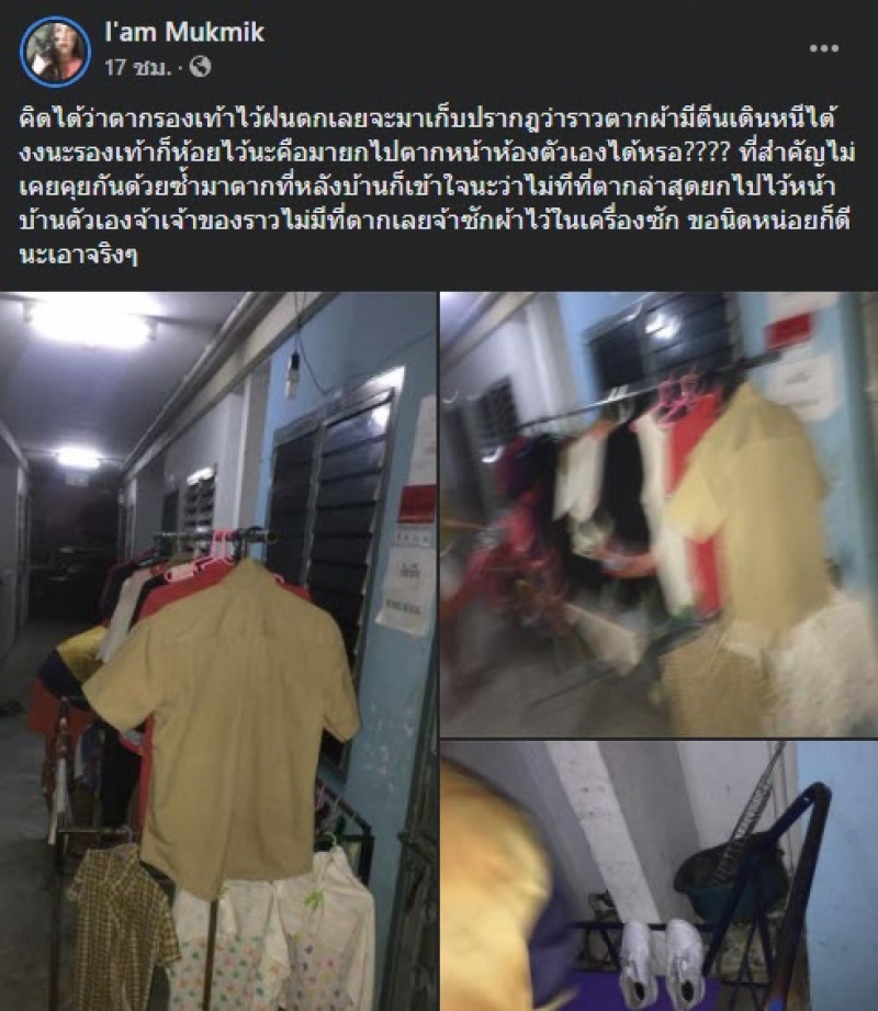 คิดได้ว่าตากรองเท้าไว้ฝนตกเลยจะมาเก็บปรากฎว่าราวตากผ้ามีตีนเดินหนีได้ งงนะรองเท้าก็ห้อยไว้นะคือมายกไปตากหน้าห้องตัวเองได้หรอ ที่สำคัญไม่เคยคุยกันด้วยซ้ำมาตากที่หลังบ้านก็เข้าใจนะว่าไม่ทีที่ตากล่าสุดยกไปไว้หน้าบ้านตัวเองจ้าเจ้าของราวไม่มีที่ตากเลยจ้าซักผ้าไว้ในเครื่องซัก ขอนิดหน่อยก็ดีนะเอาจริงๆ